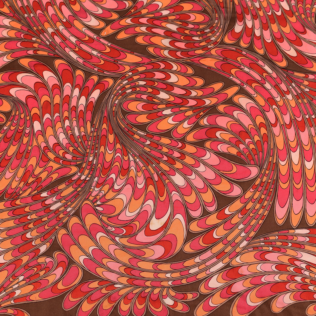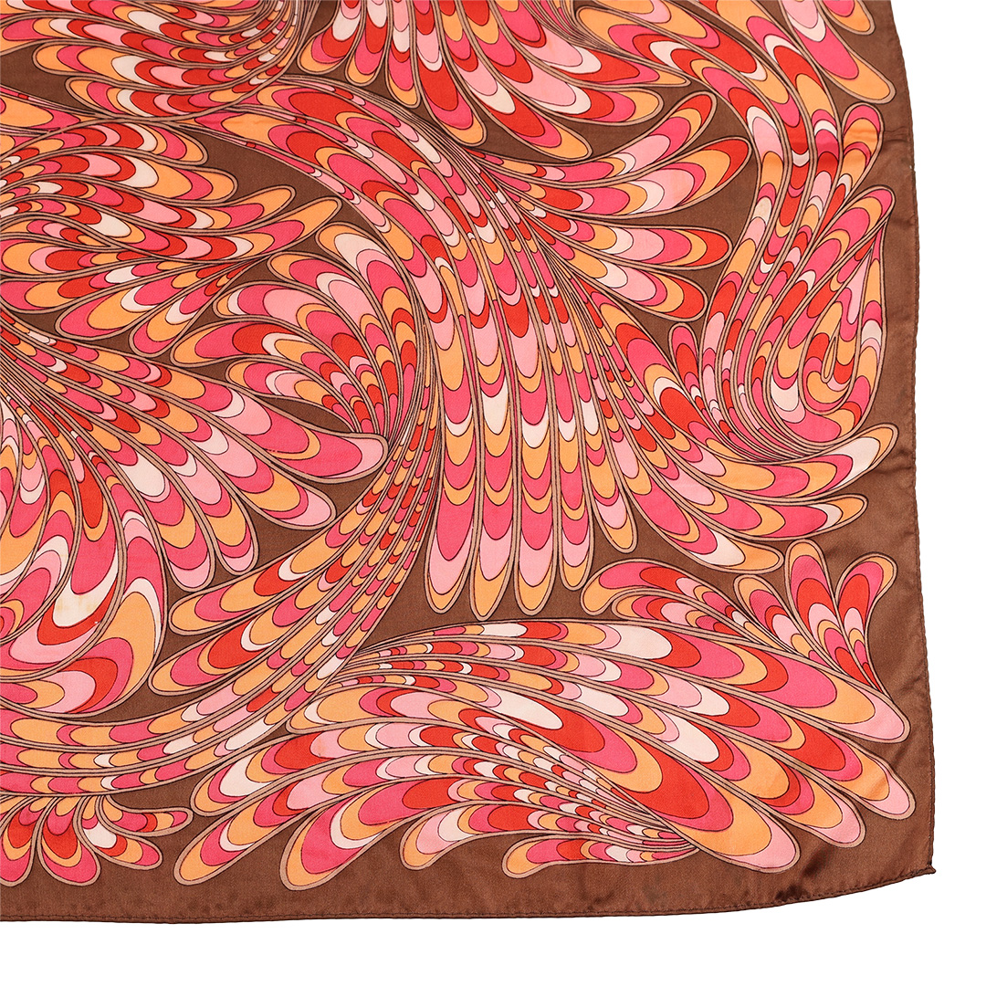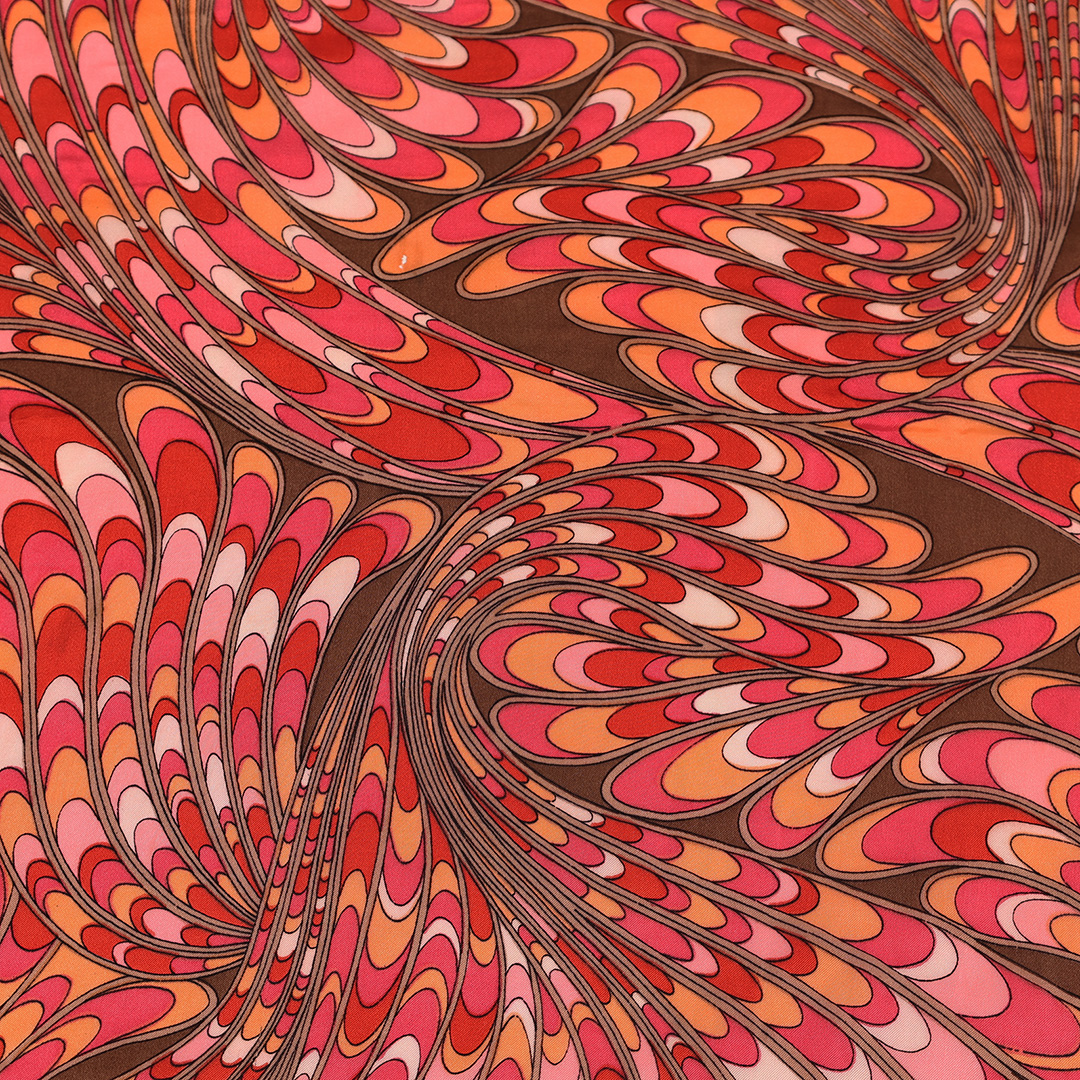オレンジやピンクを基調とした流れるような抽象柄は、まるでアートピースのような存在感があり、コーディネートに華やかさをプラスしてくれます。