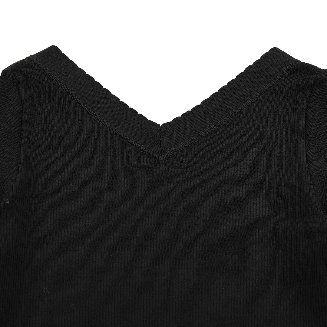 Vネックが顔周りをすっきりと見せ、程よい抜け感をプラス。