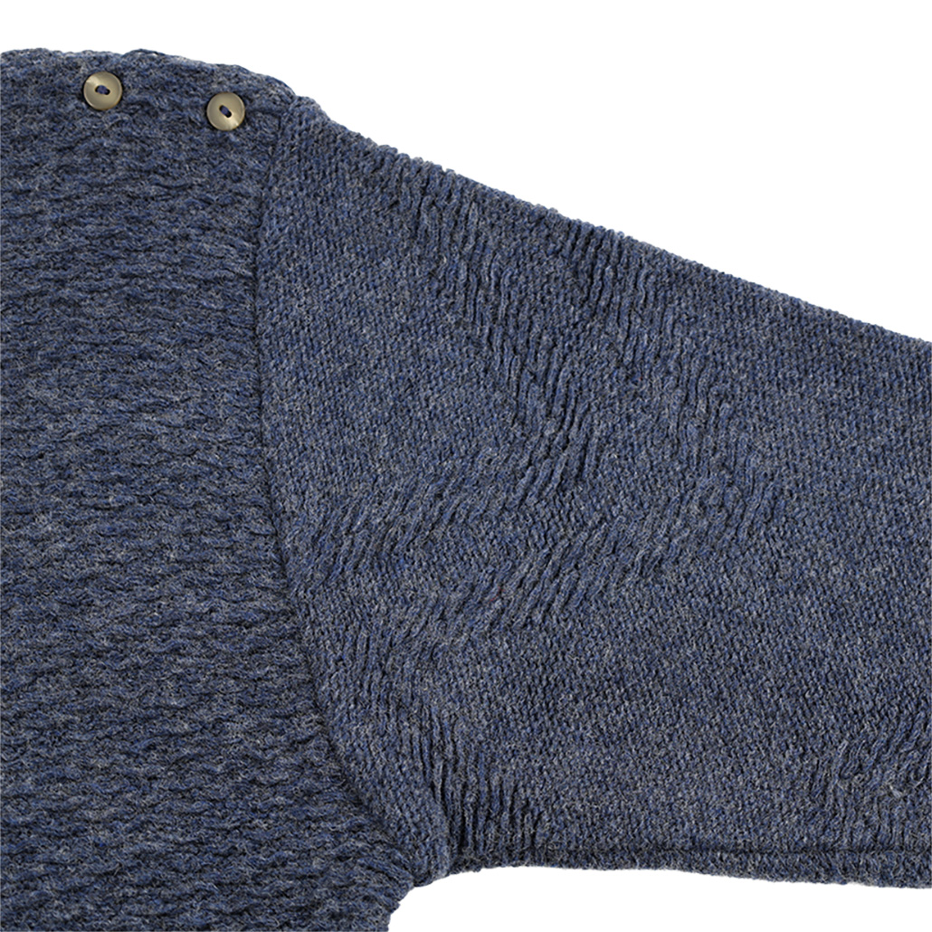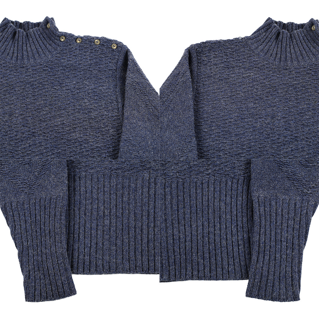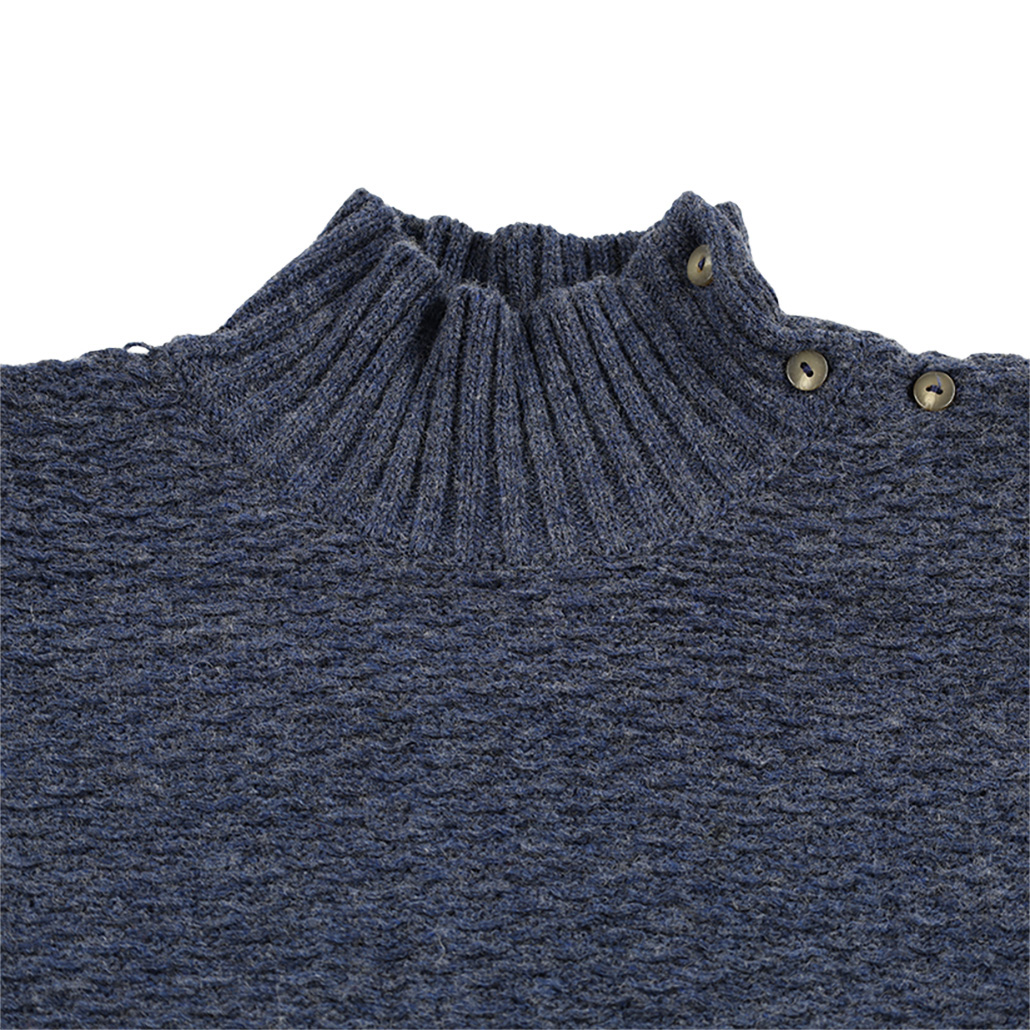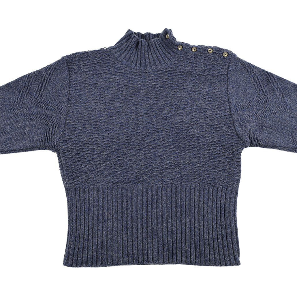 商品について:肩のボタンディテールがアクセントになる、ハイネック編み込みニットトップス。