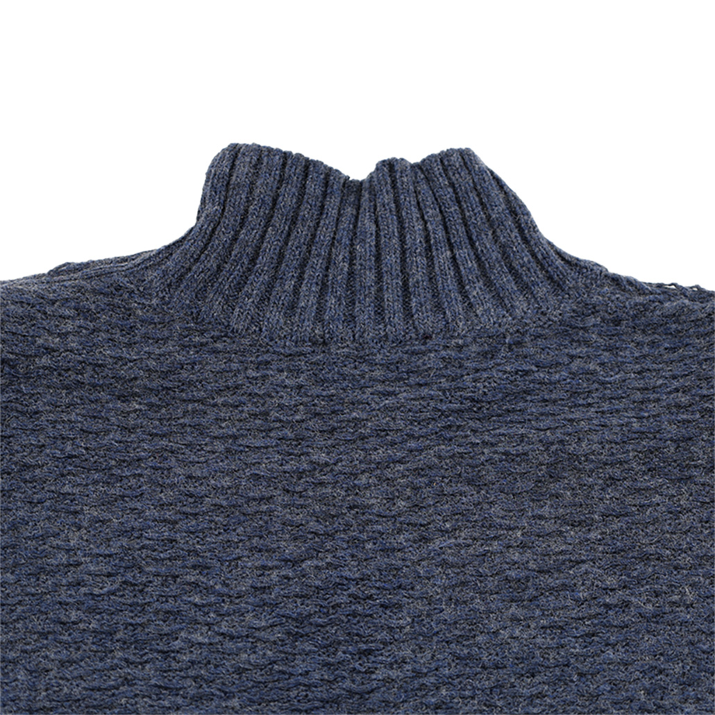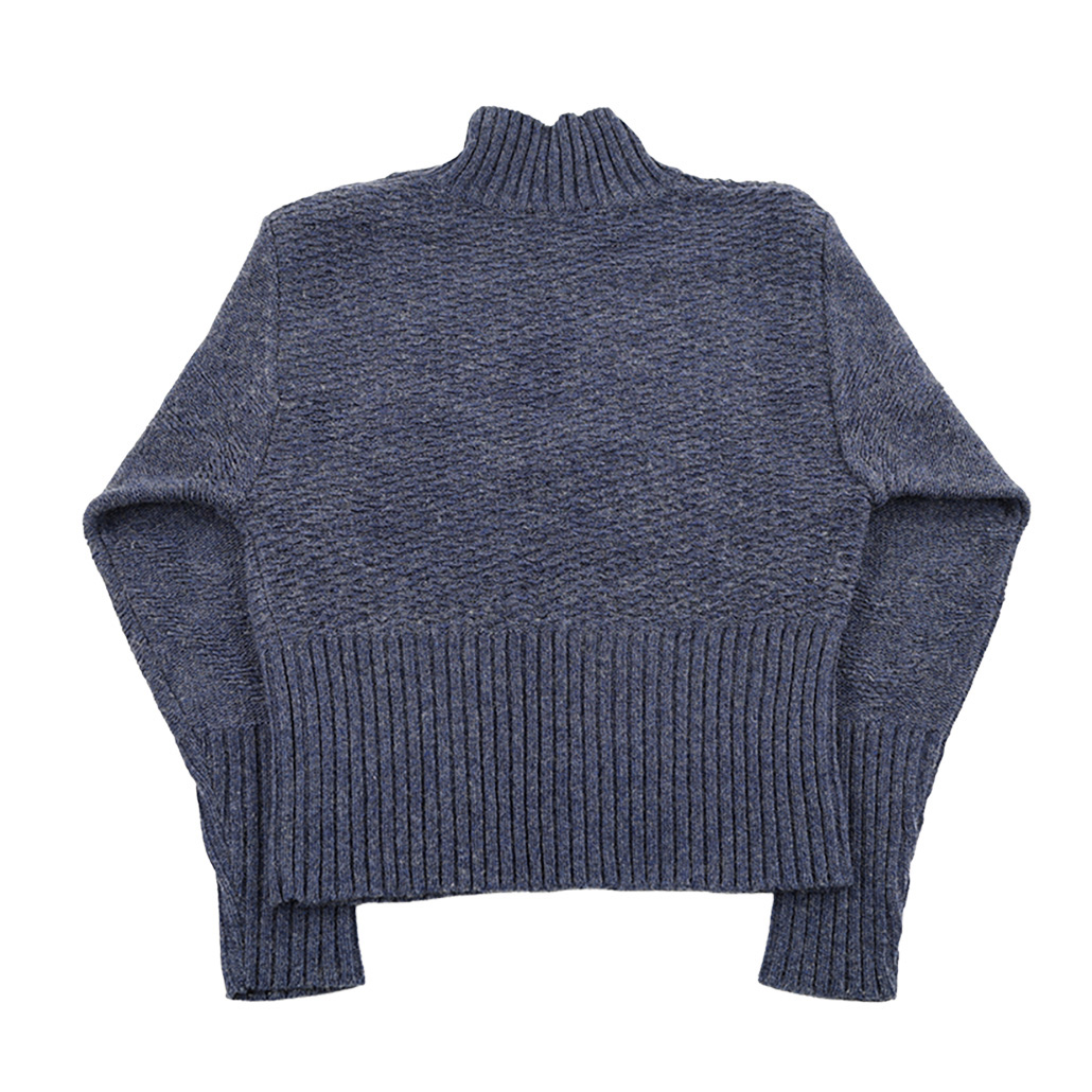 控えめなハイネックは顔回りをきれいに見せてくれ、ボタンでアクセントをプラスしました。