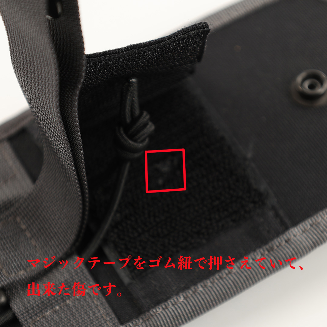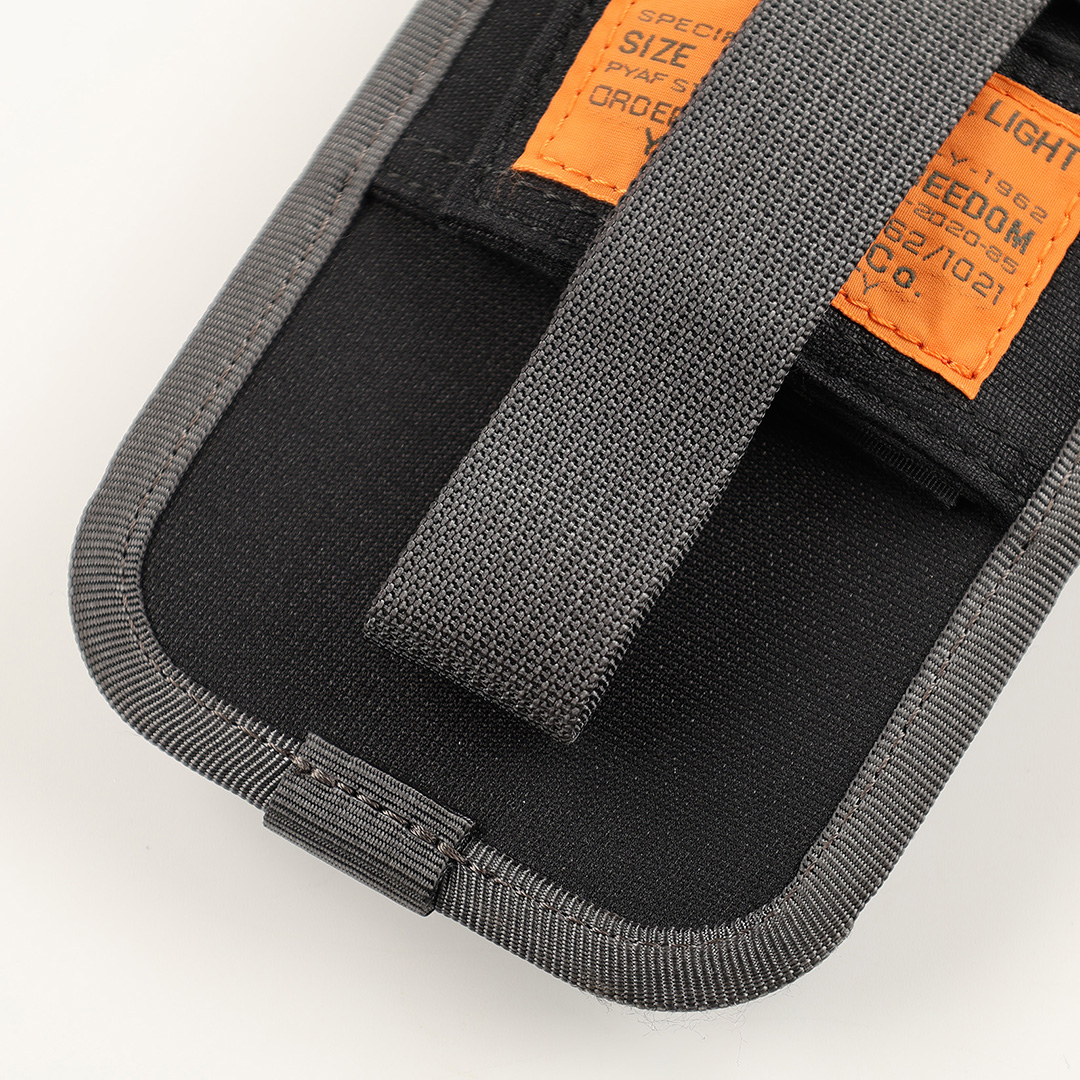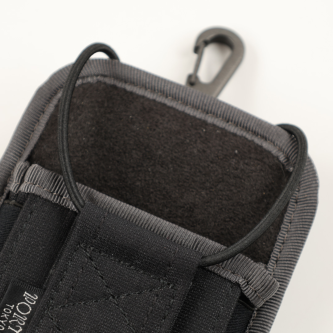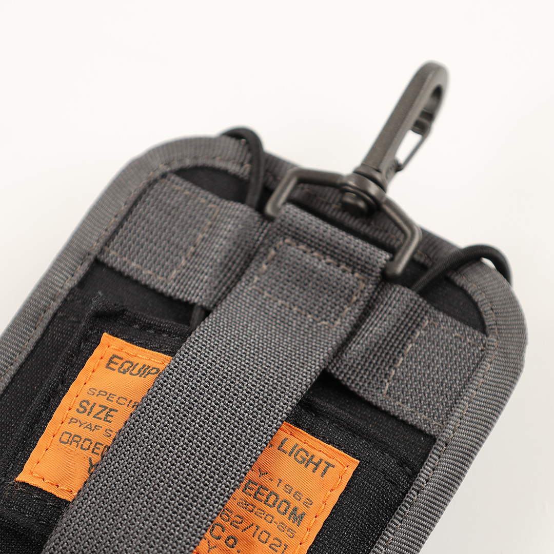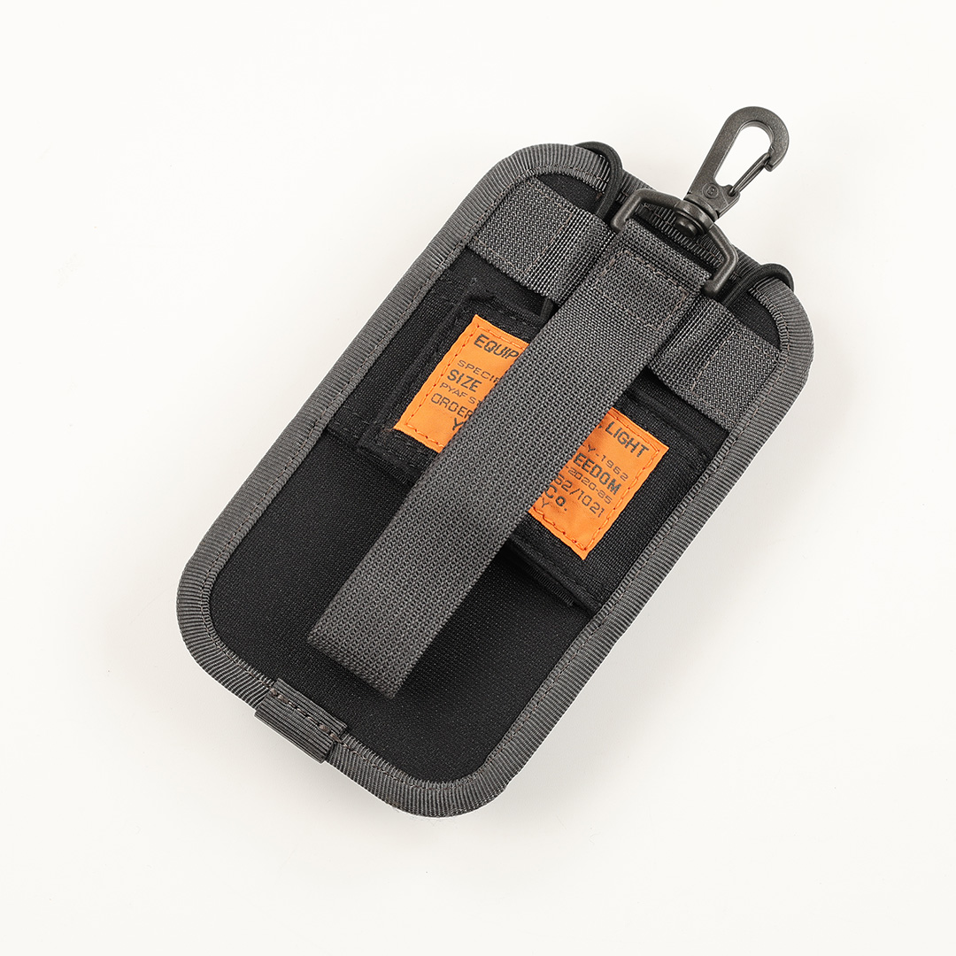 商品説明 :発売当時は、スマートフォンも収納できるデバイスホルダーでした(iPhone SE世代)。ホルダーを固定する仕様が3箇所あり、上部に付いたナスカン、縦に伸ばしたホック付のナイロンテープ、横に配した面ファスナーテープです。Dカンやバッグのストラップ、パンツのベルトループなど、自分の待ち運びしやすいところでアタッチメントが可能です。
